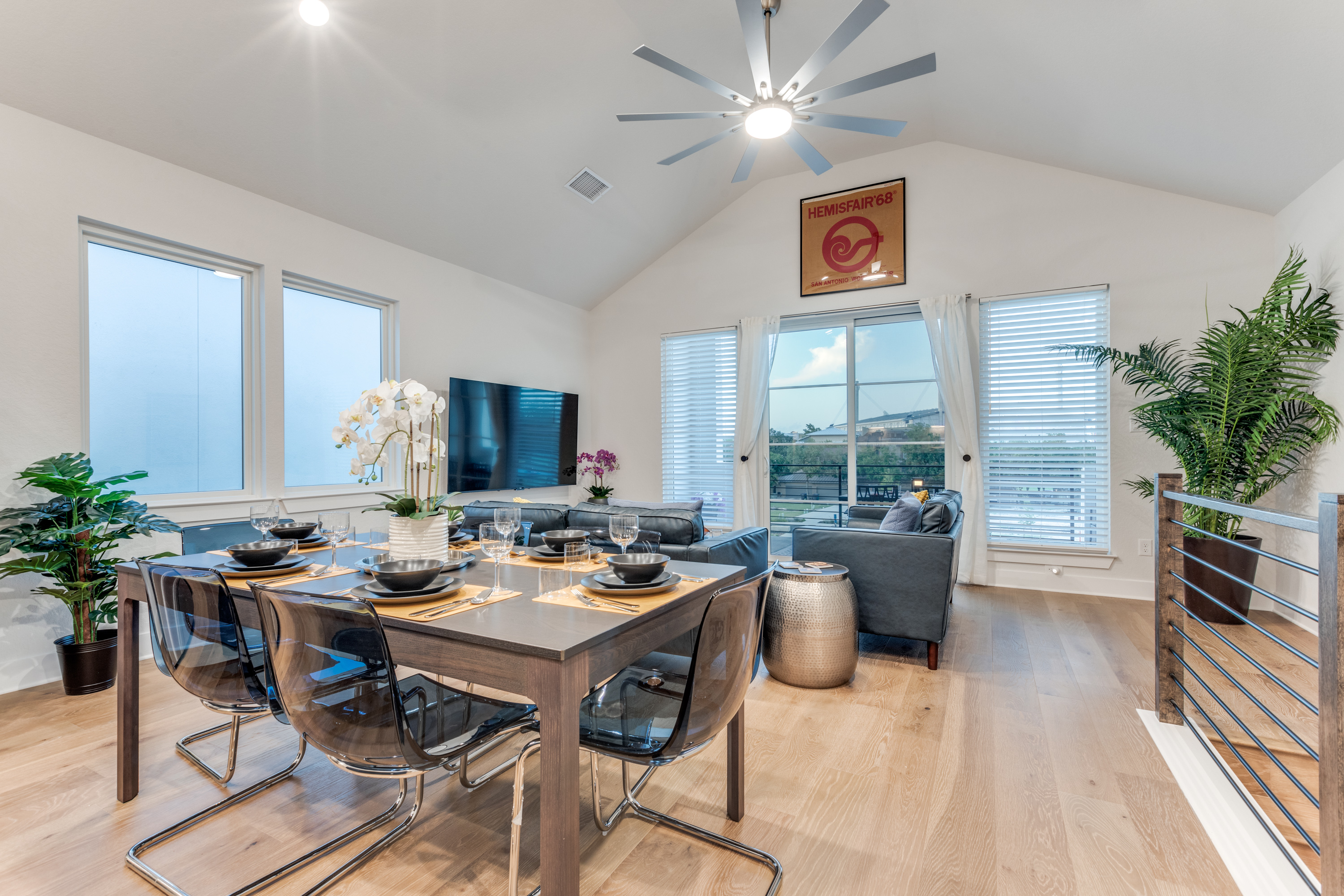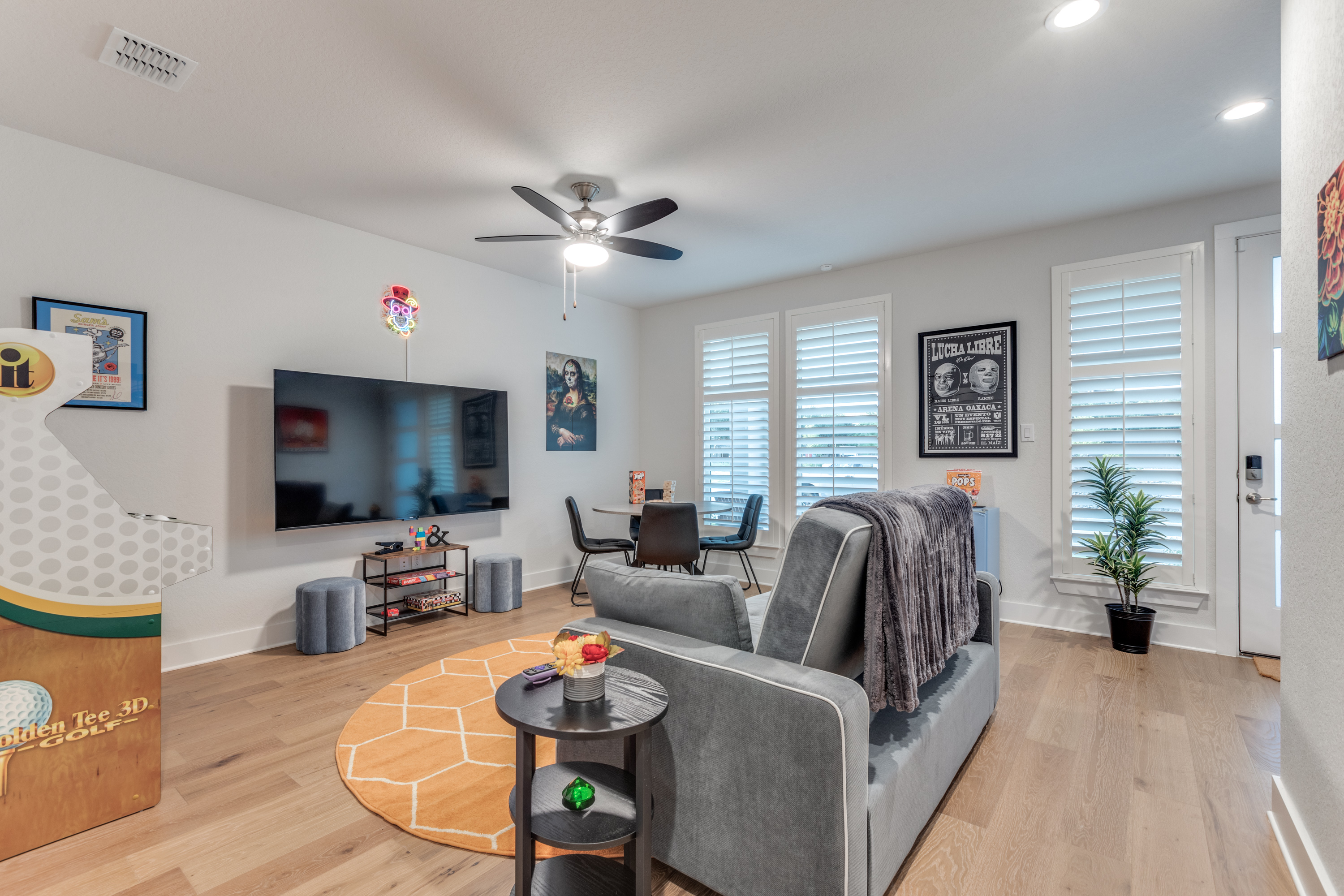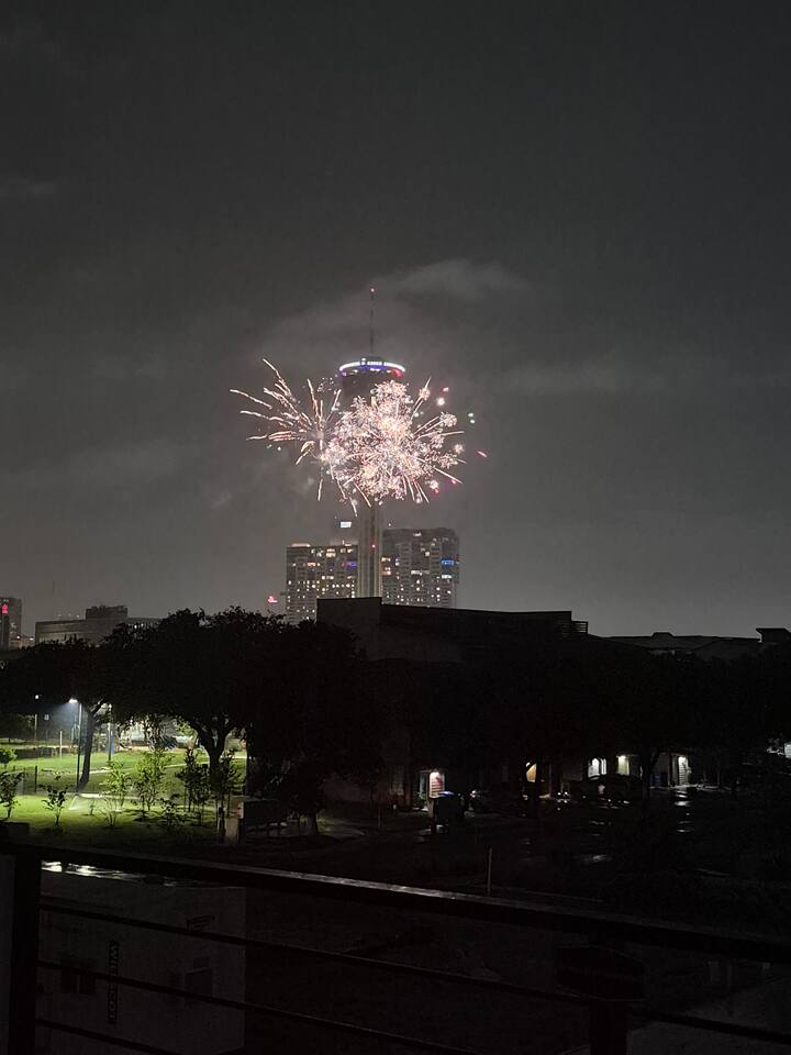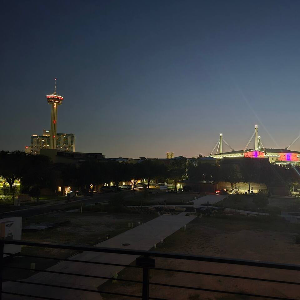 š Highlights ⢠Prime Location: -Just a 15-minute walk to the Riverwalk, Alamodome, Tower of the Americas, and Henry B. GonzĆ”lez Convention Center ā plus countless restaurants, cafĆ©s, and local favorites nearby. -Just a 20 minute drive to Lackland Air Force Base for Basic Military Training (BMT) Graduations. ⢠Stylish Comfort: Beautifully furnished with a refined modern design and curated San Antonio-inspired artwork throughout. ⢠Spacious āGreat Roomā Living: Open-concept kitchen, dining, and living areas beneath a dramatic 15ā vaulted ceiling ā perfect for entertaining, family gatherings, or relaxing together after a day downtown. ⢠Flexible Sleeping Arrangements: ā (2) King master suites with ensuite baths ā Third-floor bedroom can be arranged as a short king (75"L x 76"W), or two twin beds your choice! ā Queen Serta convertible bed in the game room ⢠Chef-Ready Kitchen: Fully stocked with quality cookware, dishes, and utensils ā ready for everything from quick breakfasts to gourmet meals. ⢠ā Coffee & Tea Bar: Enjoy your morning pick-me-up with a fully stocked coffee station including ground coffee, K-pods, decaf, creamer, and assorted teas. ⢠Outdoor Spaces with a View: Three private balconies with Tower of the Americas and Alamodome views ā ideal for sunrise coffee or sunset cocktails. ⢠Entertainment for Everyone: Challenge friends on the Golden Tee Deluxe arcade game, or choose from a wide selection of board and card games for family fun. ⢠Smart Entertainment Setup: ā 75" Roku Smart TVs in the living room and game room ā 50" Roku TVs in every bedroom ā Stream your favorite shows using your own accounts in seconds ⢠Convenient & Secure Parking: Attached 2-car garage ā a rare find downtown ā plus complimentary Level 2 EV charging. ⢠Work & Play Ready: Fast AT&T Fiber Wi-Fi throughout and a dedicated workspace for remote work or trip planning. ⢠In-Home Laundry: Full washer, dryer, and ironing essentials for extended stays or freshening up during your trip. šŗšø Military & Law Enforcement Discount: Weāre proud to offer a special discount for our heroes!