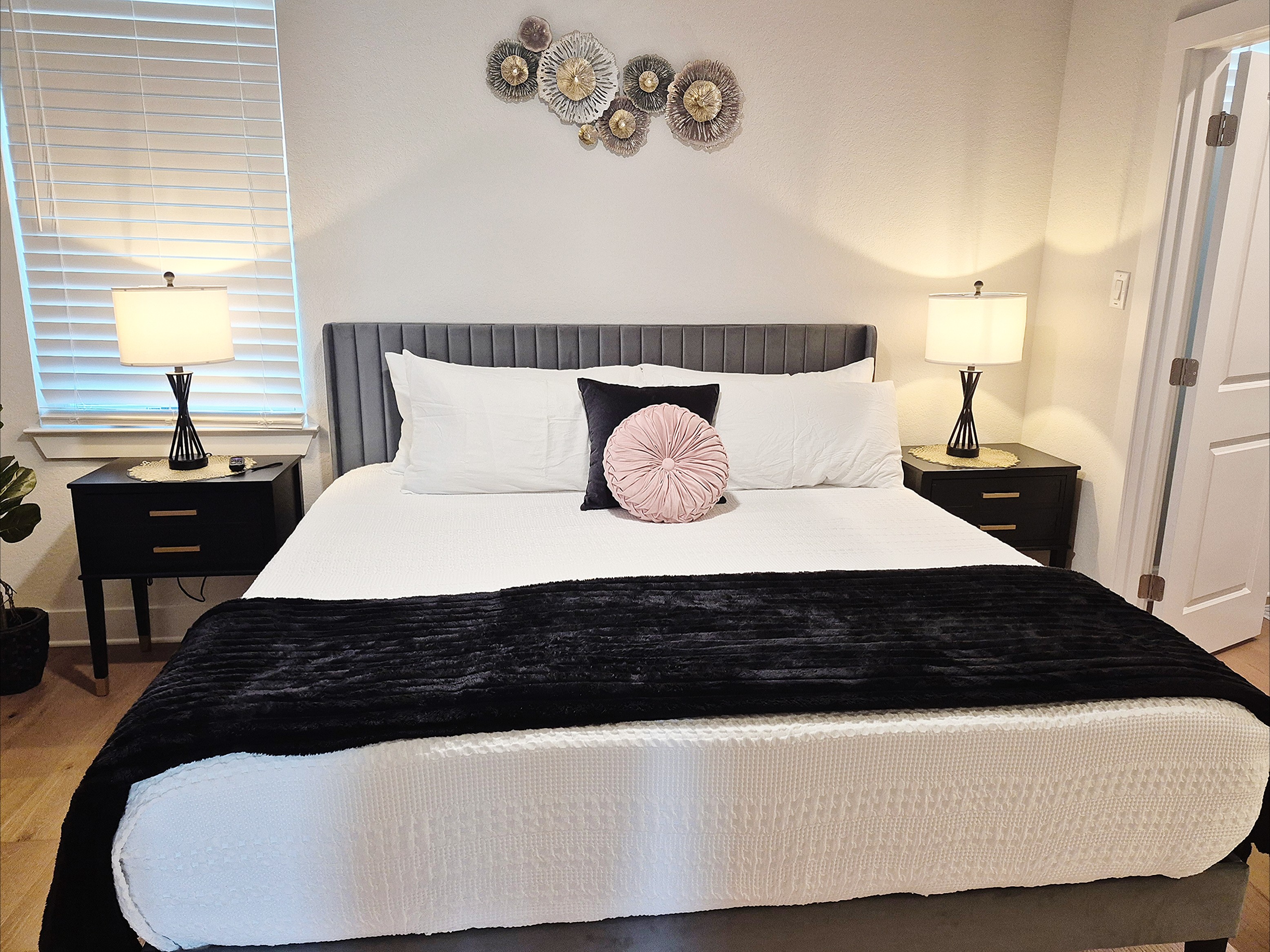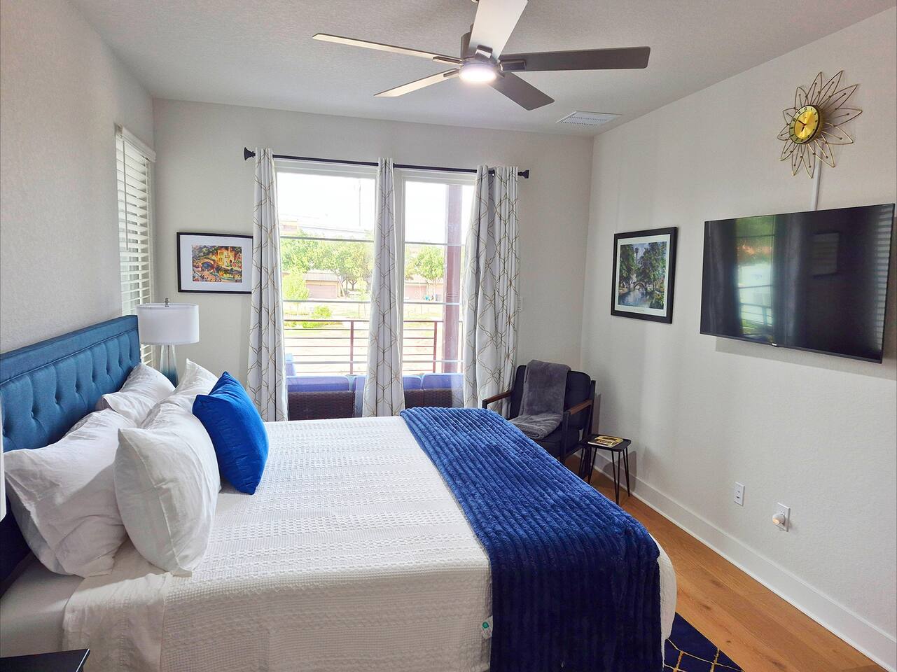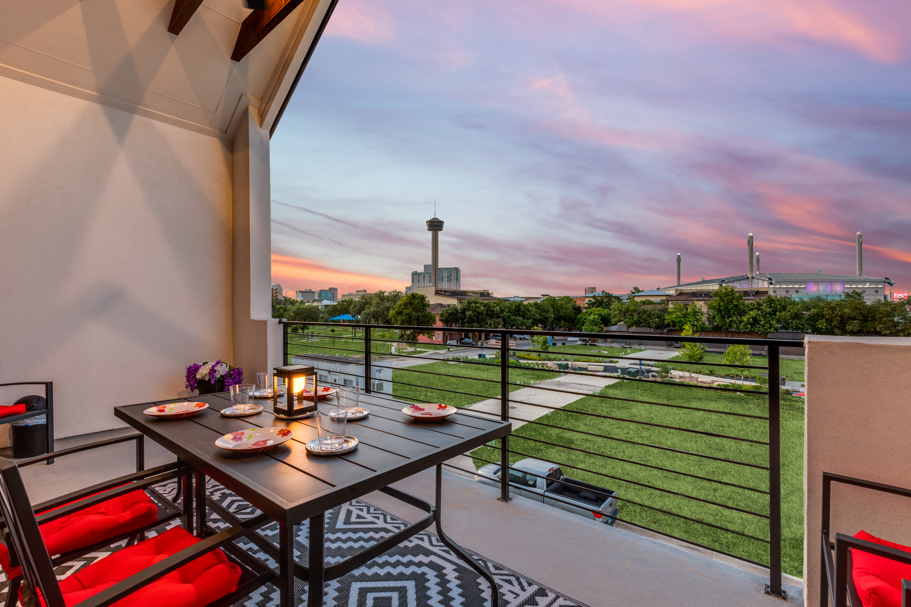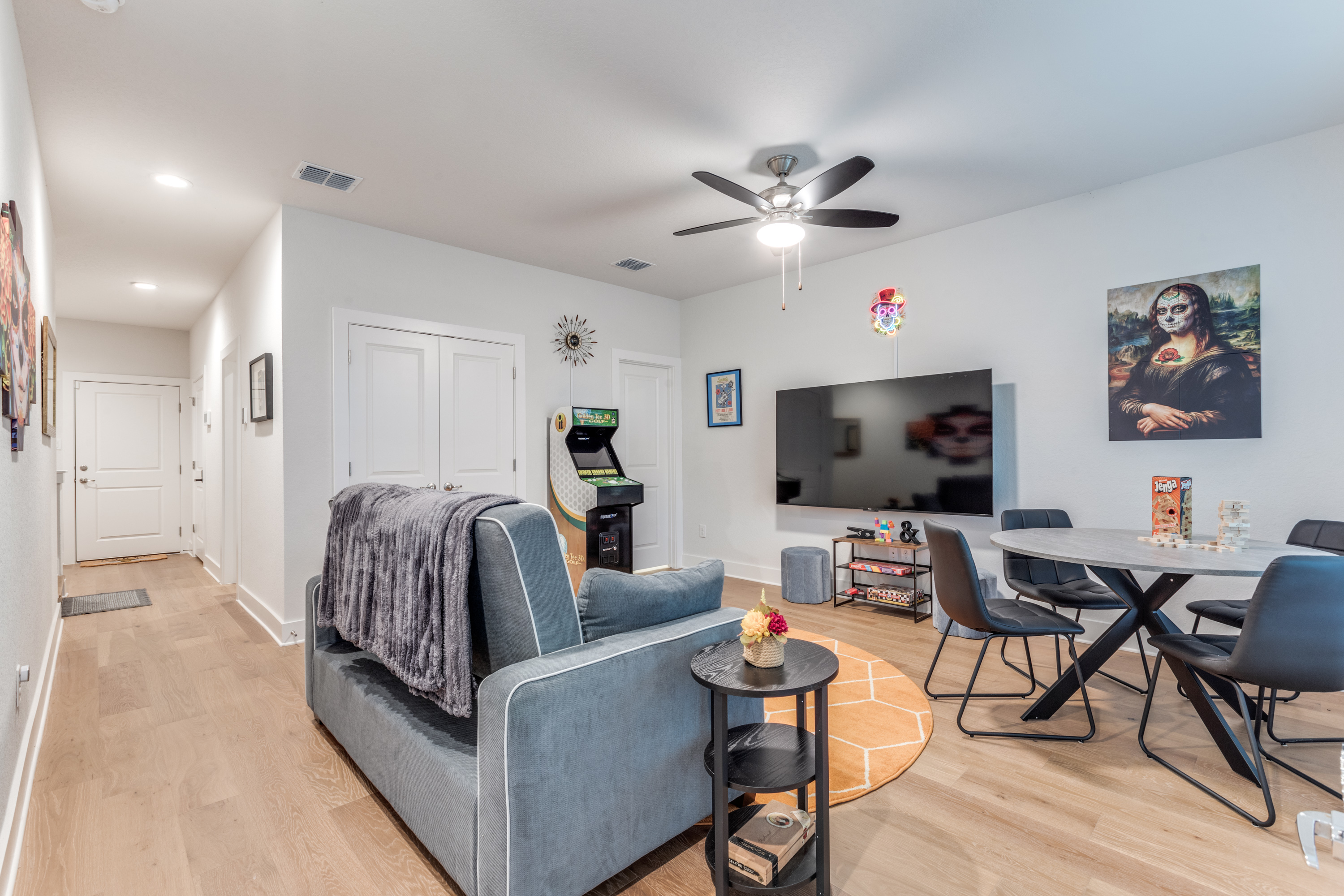 š Highlights ⢠Prime Location: -Just a 15-minute walk to the Riverwalk, Alamodome, Tower of the Americas, and Henry B. GonzĆ”lez Convention Center ā plus countless restaurants, cafĆ©s, and local favorites nearby. -Just a 20 minute drive to Lackland Air Force Base for Basic Military Training (BMT) Graduations. ⢠Stylish Comfort: Beautifully furnished with a refined modern design and curated San Antonio-inspired artwork throughout. ⢠Spacious āGreat Roomā Living: Open-concept kitchen, dining, and living areas beneath a dramatic 15ā vaulted ceiling ā perfect for entertaining, family gatherings, or relaxing together after a day downtown. ⢠Flexible Sleeping Arrangements: ā (2) King master suites with ensuite baths ā Third-floor bedroom can be arranged as a short king (75"L x 76"W), or two twin beds your choice! ā Queen Serta convertible bed in the game room ⢠Chef-Ready Kitchen: Fully stocked with quality cookware, dishes, and utensils ā ready for everything from quick breakfasts to gourmet meals. ⢠ā Coffee & Tea Bar: Enjoy your morning pick-me-up with a fully stocked coffee station including ground coffee, K-pods, decaf, creamer, and assorted teas. ⢠Outdoor Spaces with a View: Three private balconies with Tower of the Americas and Alamodome views ā ideal for sunrise coffee or sunset cocktails. ⢠Entertainment for Everyone: Challenge friends on the Golden Tee Deluxe arcade game, or choose from a wide selection of board and card games for family fun. ⢠Smart Entertainment Setup: ā 75" Roku Smart TVs in the living room and game room ā 50" Roku TVs in every bedroom ā Stream your favorite shows using your own accounts in seconds ⢠Convenient & Secure Parking: Attached 2-car garage ā a rare find downtown ā plus complimentary Level 2 EV charging. ⢠Work & Play Ready: Fast AT&T Fiber Wi-Fi throughout and a dedicated workspace for remote work or trip planning. ⢠In-Home Laundry: Full washer, dryer, and ironing essentials for extended stays or freshening up during your trip. šŗšø Military & Law Enforcement Discount: Weāre proud to offer a special discount for our heroes!
