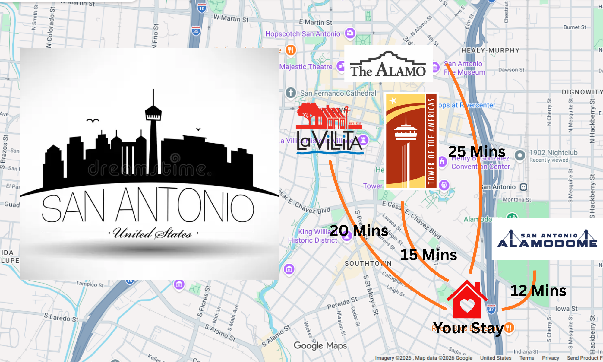 🎶 "Is anybody goin' to San Antone?" 🎶 Experience the vibrant heart of San Antonio at Home at the Alamodome – just a stroll from the Riverwalk, Alamodome, and top attractions. This stylish, spacious retreat blends modern comfort with local flair, featuring vaulted ceilings, curated artwork, and versatile sleeping options. Whether visiting for a family getaway, military graduation, or downtown adventure, unwind in a thoughtfully equipped sanctuary designed for connection and relaxation.